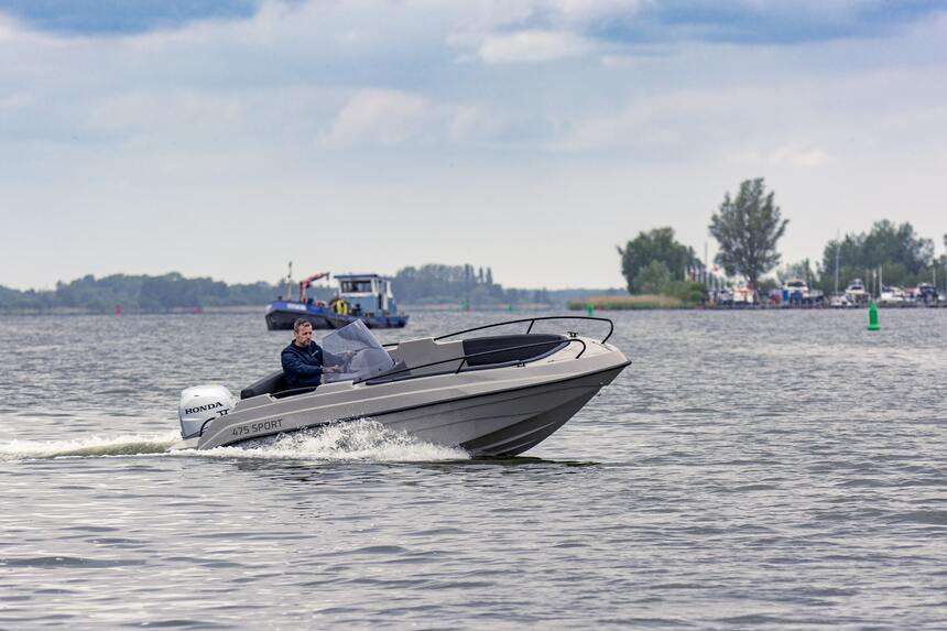 Das Giant 475 Sport sorgt mit einer Motorleistung von bis zu 60 PS für pure Fahrfreude und ein dynamisches Erlebnis auf dem Wasser. Das markante, sportliche Design wird durch eine elegante Reling und eine seitliche Steuerkonsole mit getönter Windschutzscheibe unterstrichen. Die komfortable vordere Sitzbank und das großzügige Sonnendeck bieten ideale Plätze zum Entspannen. Das offene Heck ermöglicht mühelosen Einstieg und Ausstieg, während optionale Badeplattformen mit teleskopischer Badeleiter den Komfort weiter erhöhen und den Zugang zum Wasser vereinfachen.